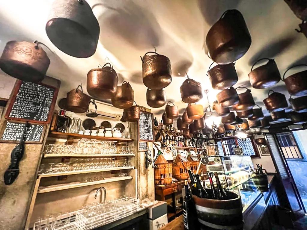The decor instantly transports you to another era. The ceiling is adorned with dozens of copper pots, and the demijohns of wine behind the counter give the place an undeniable old-world charm. It is incredibly popular with locals and boasts a massive selection of over 150 wines and classic cicchetti, particularly their famous baccalà (creamed cod), sardines, and tuna.