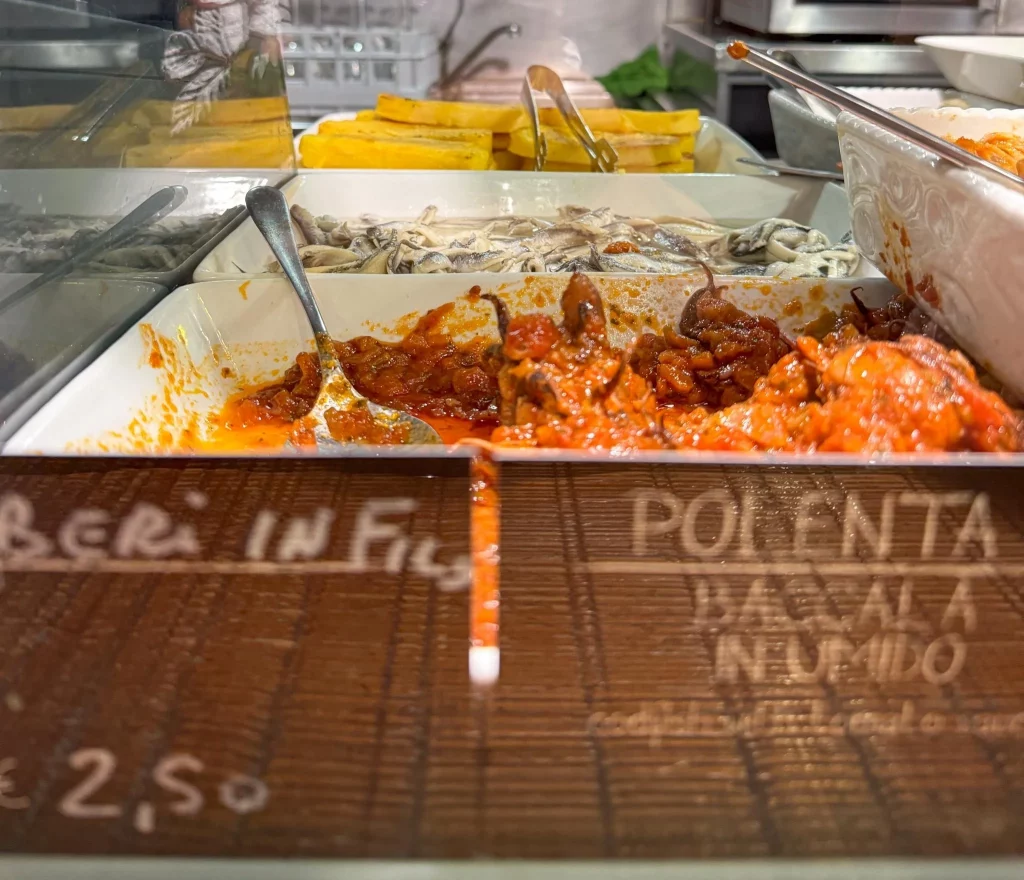 The atmosphere is familiar and welcoming. You order directly at the counter without rushing. The rules are simple: point out the cicchetti that catch your eye, grab your glass of ombra, and join the groups gathered around the bar or spilling out onto the pavement. Don’t be surprised if the space is tiny and tables are non-existent—standing up is part of the charm!