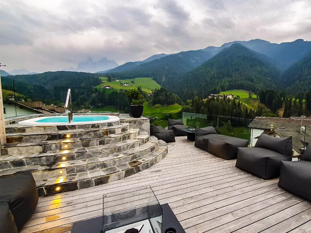If there’s a better way to end a day of trekking than soaking in a rooftop jacuzzi, I haven’t found it yet. From the terrace, the landscape is a masterclass in contrasts: soft, rolling green meadows in the foreground, with the sun-bleached, defiant peaks of the Odle range playing hide-and-seek with the clouds behind them. It is, quite simply, a place where words fall short.